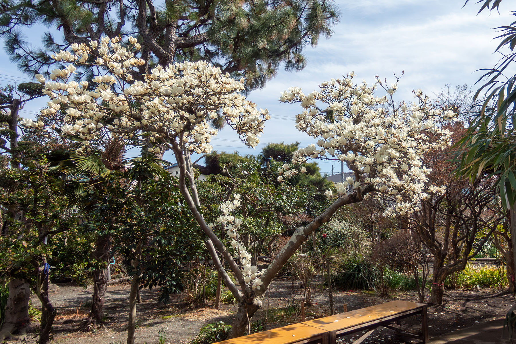 春になってさまざまな木や花が芽生え始めていて、この日一番目だったのはハクモクレンの花でした。(3月7日撮影)今年はモクレンの開花も早いようですでに満開です。比較的背が低く剪定されていて目の高さで花を楽しめます。