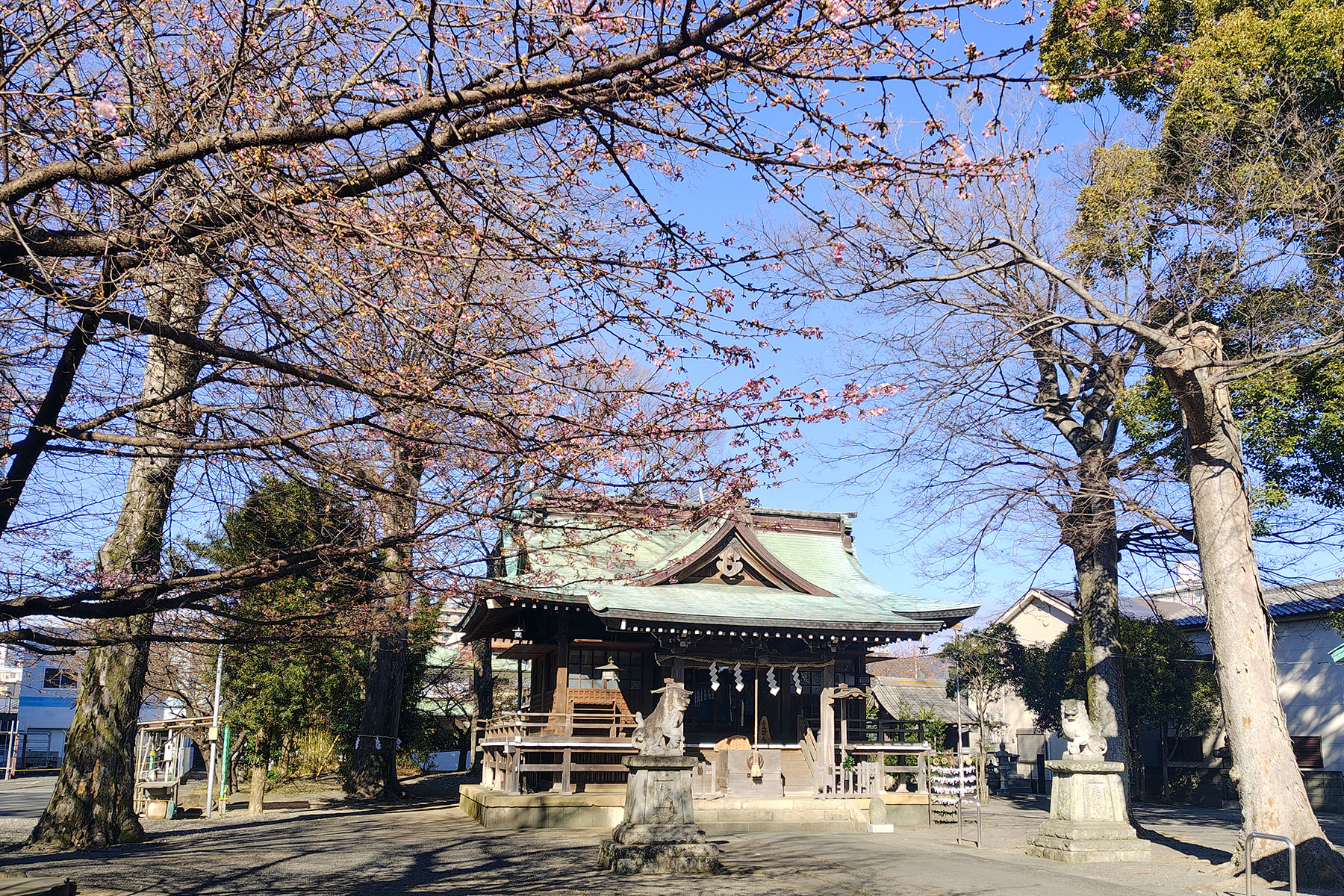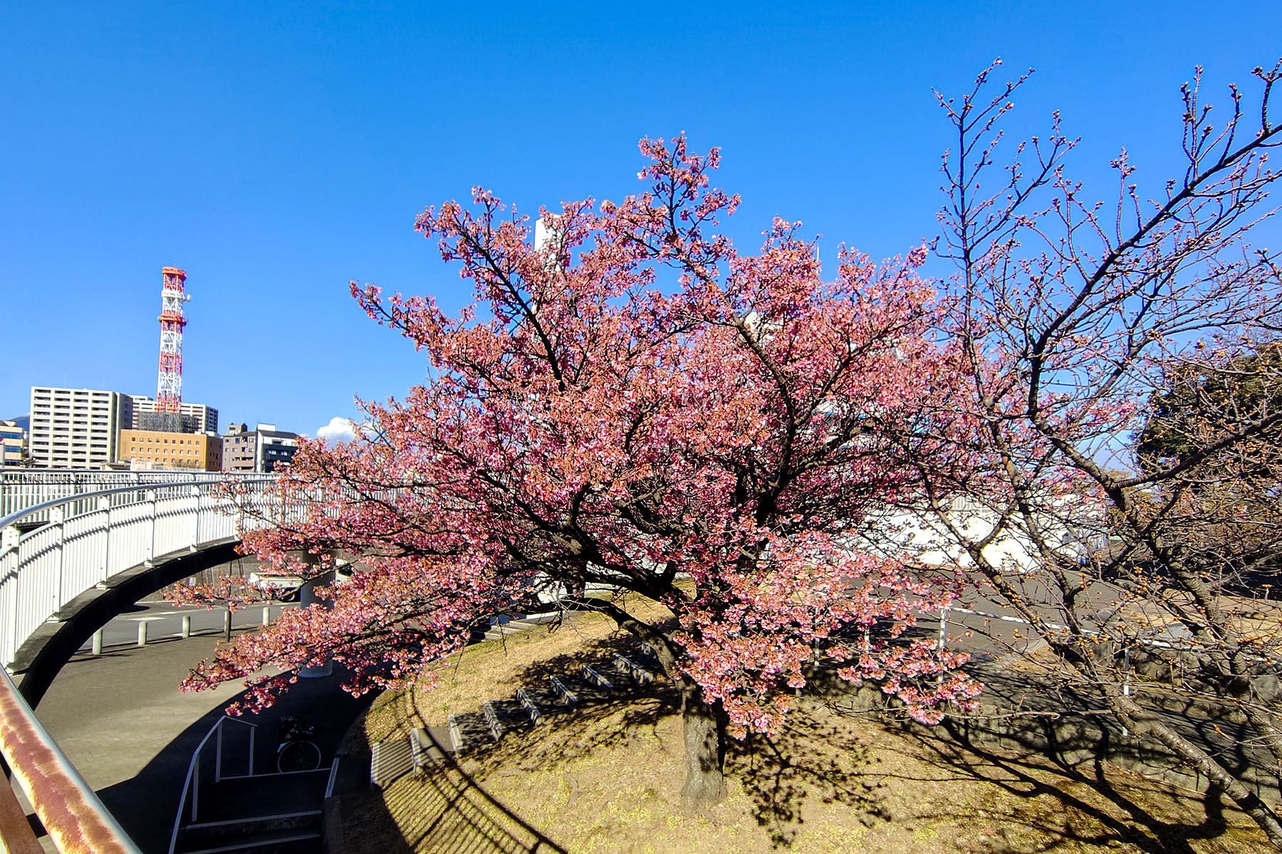 公園の隣の八幡神社の河津桜はすでに開花が始まっています。あと10日前後で見頃になりそうでした。