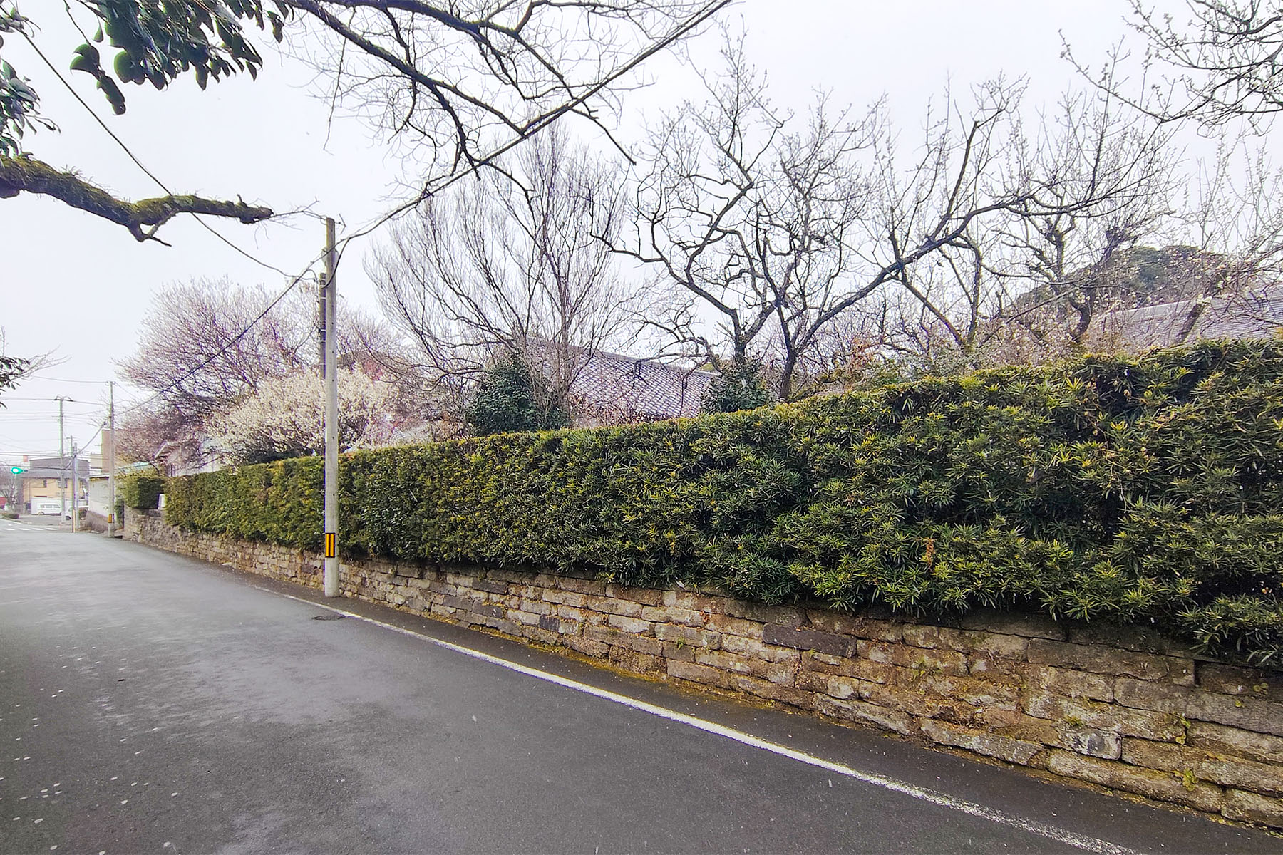 雪がちらつき始めたタイミングの大中寺の梅林の様子。1月の中旬ごろと景色はあまり変わっていないような…