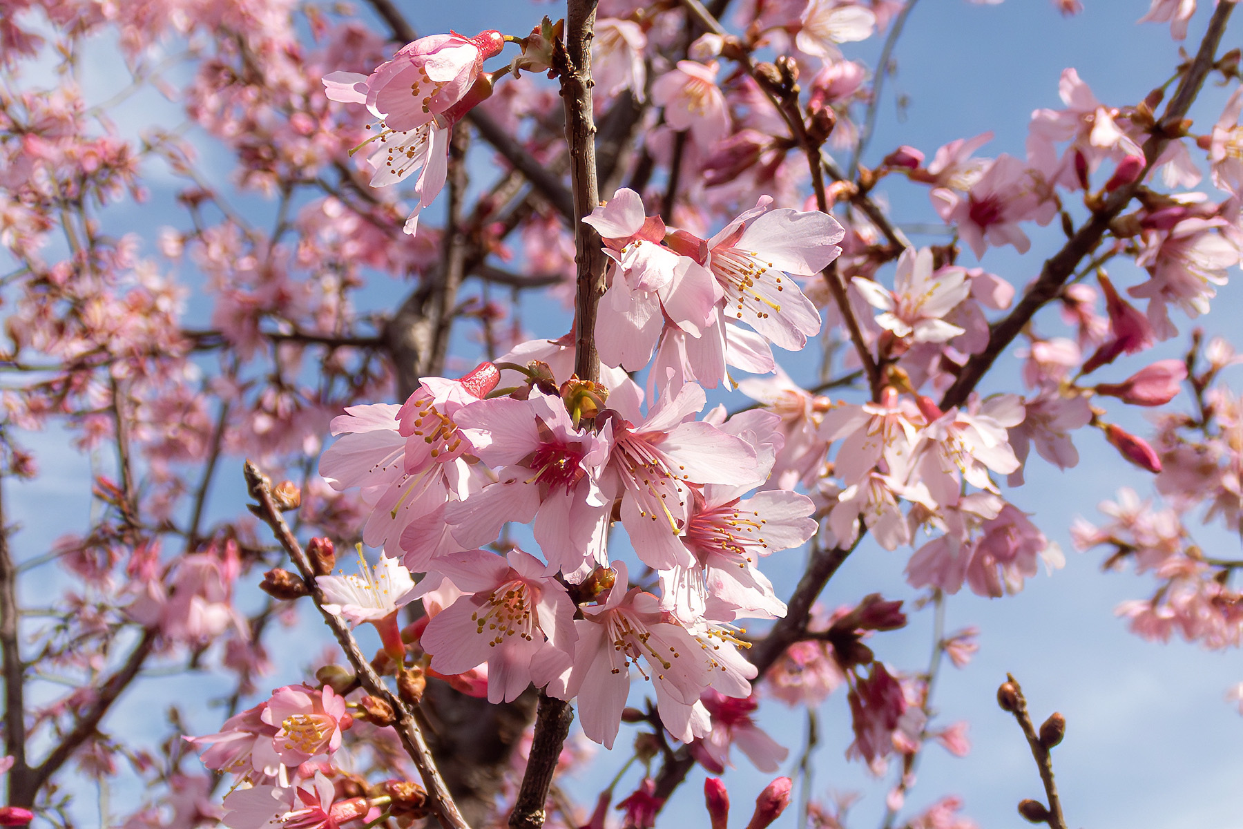 フジザクラ(富士桜)も七分咲き程度に開花が進んでいました。フジザクラは別名・豆桜ともいわれ、伊豆箱根〜富士山周辺に自生します。ただ、天城周辺の豆桜は白い花で、富士山1合目辺りに自生しているフジザクラもここまでピンク色ではなかった記憶。桜は亜種が多くて名札がなければ判別が難しいです。