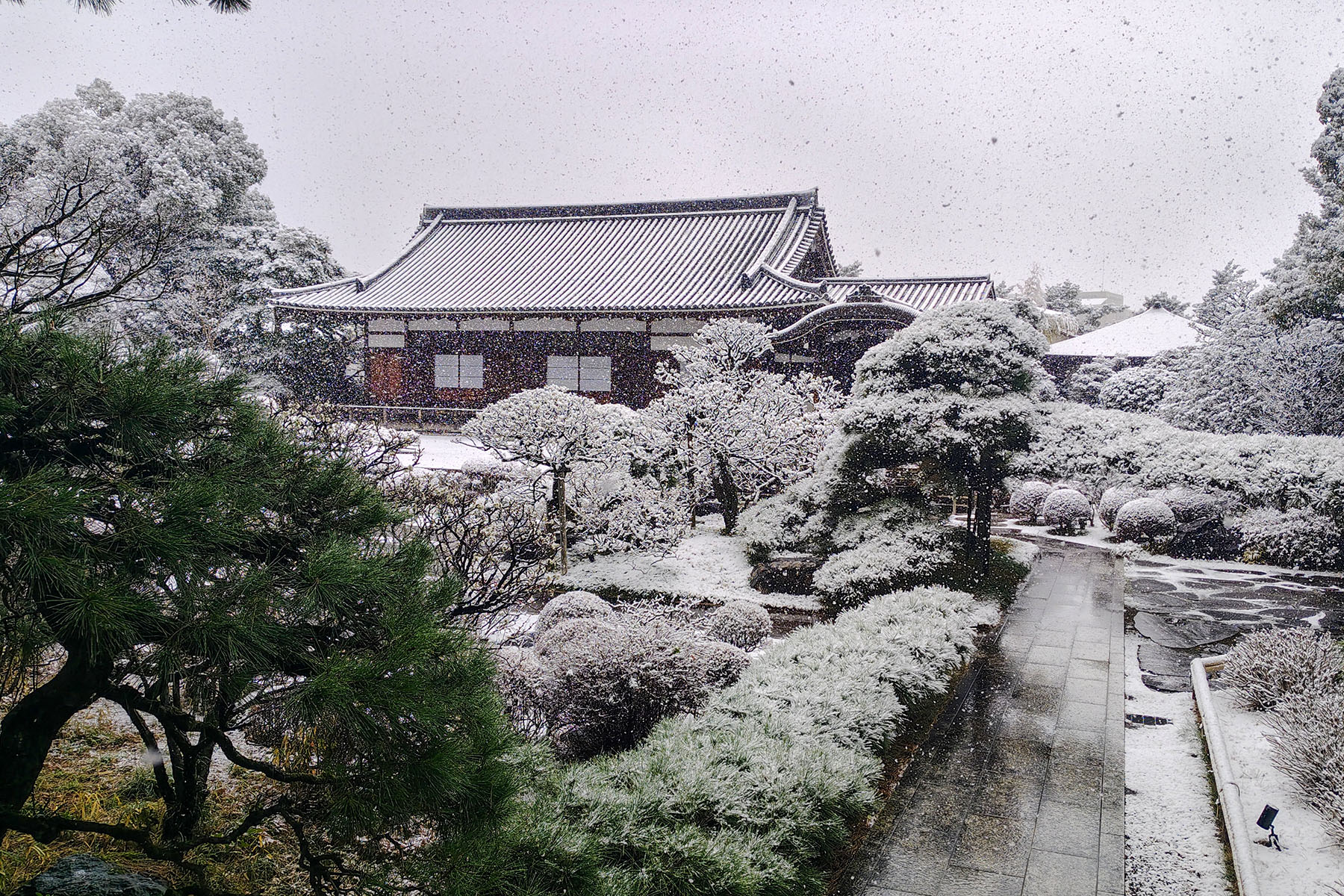 お寺の入り口の植栽もかなり白くなっていました。大変な思いをしている雪国の方には申し訳ないのですが、ちょっとテンション上がりますね。