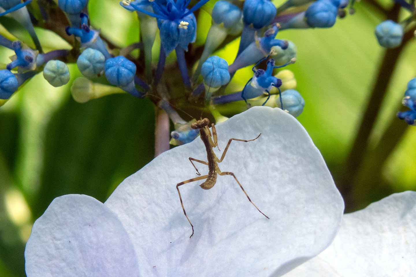 正門前のガクアジサイを観察していたら、2cm位の小さなカマキリを見つけました。とても小さいですがカタチはカマキリそのもの。花に寄ってくる虫を狙っているのでしょう。待機姿勢もカマキリらしくて微笑ましいです。