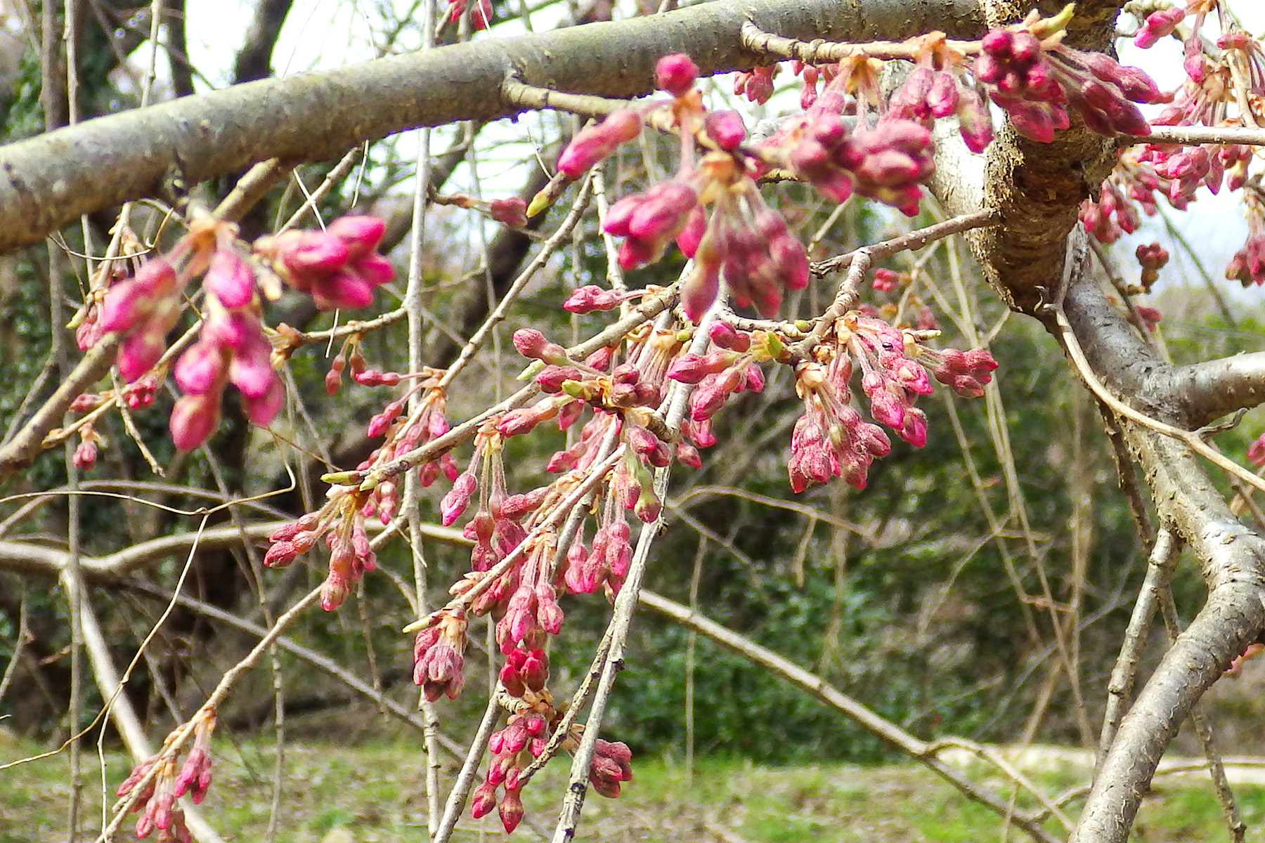 この写真は現在の三春の桜(滝桜)の様子。(3月12日撮影)大きく成長したベニシダレの枝に膨らんだつぼみをたくさん付けていました。今週末にも開花しそうな勢いです。見頃は10日〜2週間後くらいでしょうか。