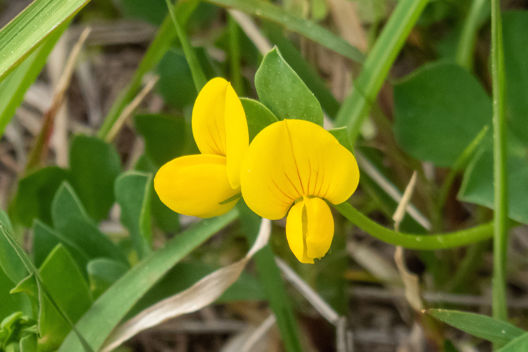 ミヤコグサはマメ科の多年草で日本全国〜東アジア一帯に分布します。日当たりの良い草地に自生し、海沿いだけではなく山地でも見ることができます。鮮やかな黄色い花を2個ずつ咲かせるので、3個以上花がつく西洋ミヤコグサと区別できます。