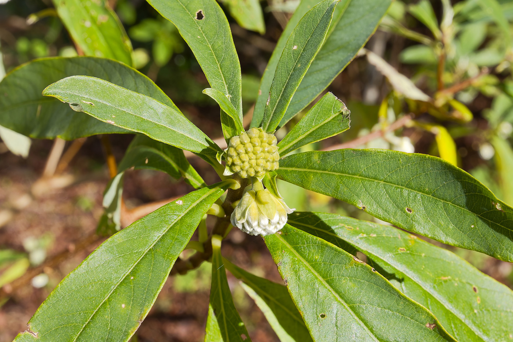ミツマタはジンチョウゲ科ミツマタ属の低木で中国・ヒマラヤ原産と言われています。昔から和紙の原料として利用され、現在でも紙幣の原料として利用されています。ミツマタの花は黄色やクリーム色、珍しいものでは赤色がありますが、このつぼみは真っ白でこの先何色の花が咲くのか興味が湧きました。