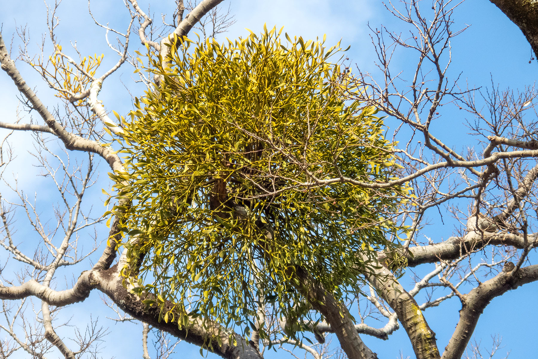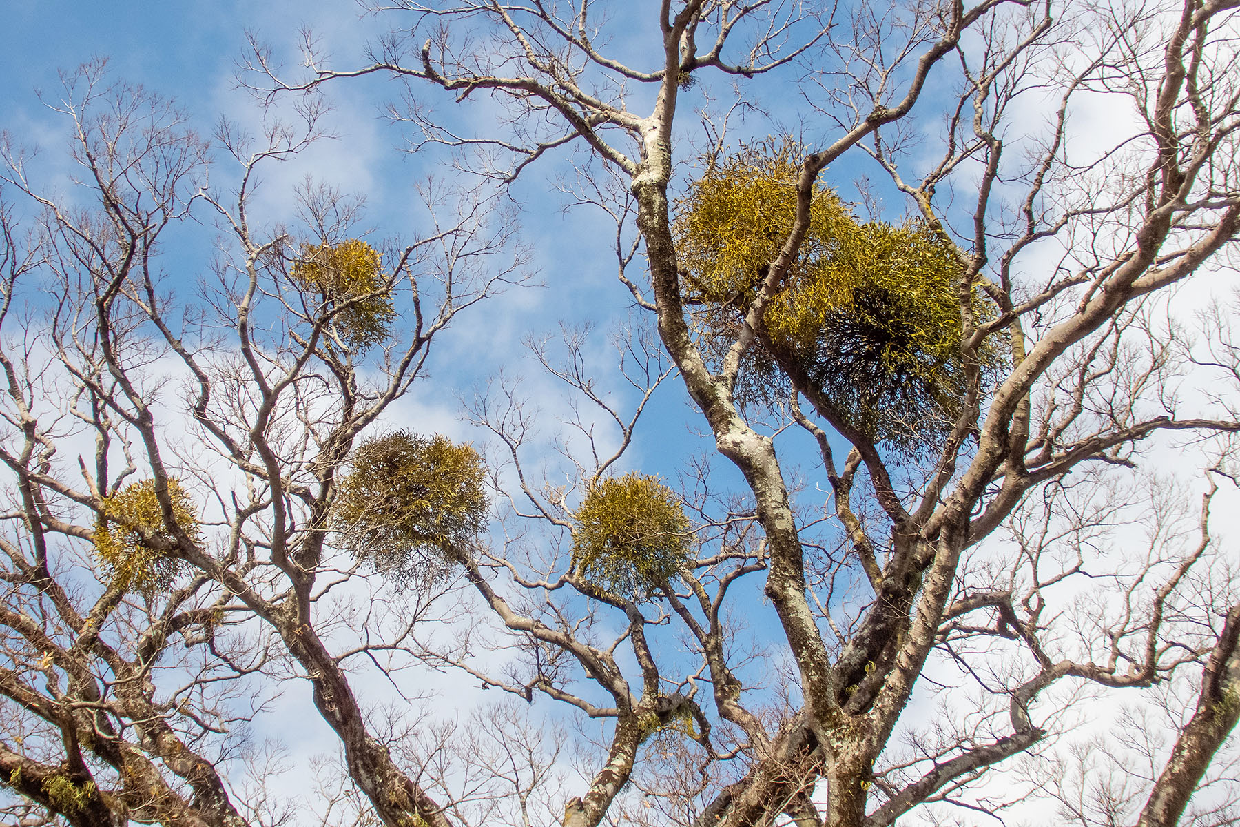 日本のヤドリギは主に落葉広葉樹の枝や幹に半寄生する常緑広葉樹です。日本各地で広く見られ、冬になると宿主の木々が落葉することからとても目立つ様になります。西洋ではヤドリギは魔除けや幸運をもたらす植物としてクリスマスなどに飾られるそうです。神が宿る木ともいわれているそうで、以前も小田原市内の曽我神社や諏訪大社の境内などで見つけたことがあります。