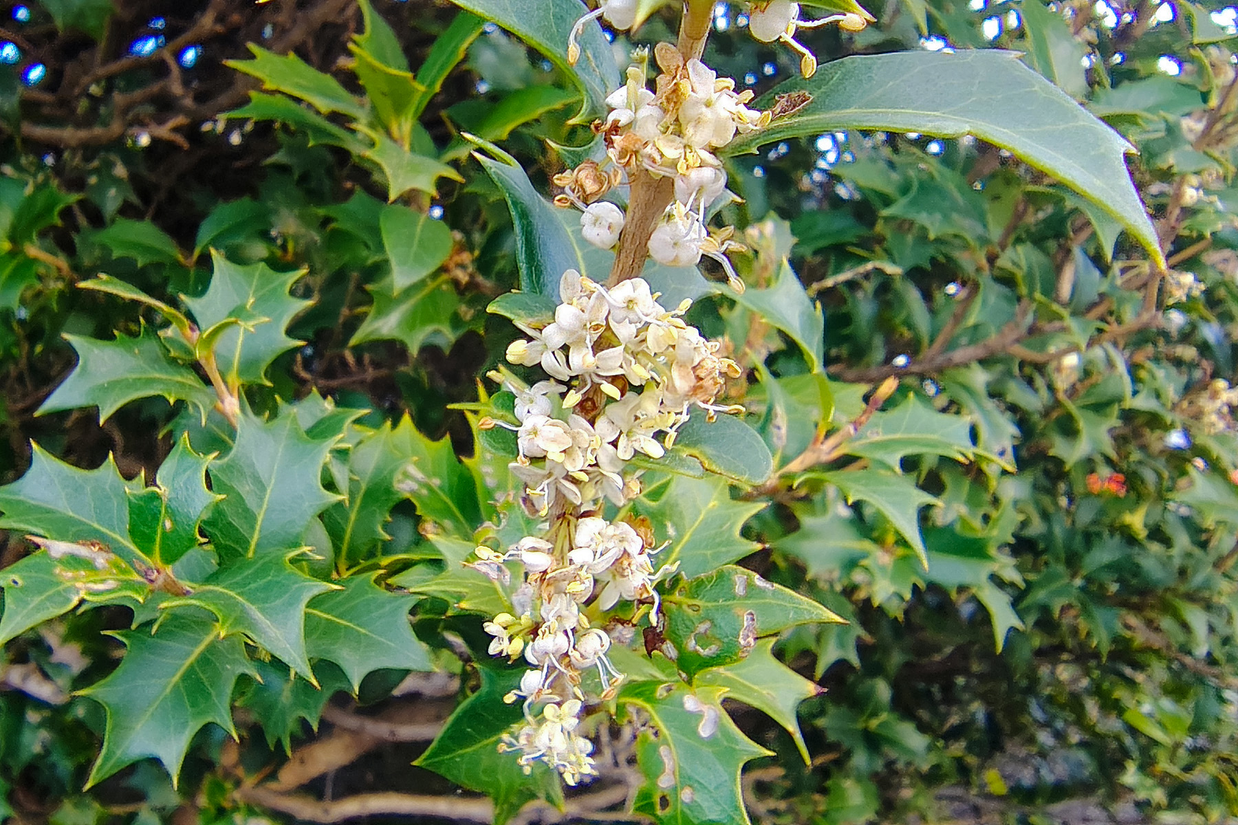 今年の正月も穏やかだったので少し足を伸ばして潮音寺というお寺まで歩いてみると、旧東海道沿いのお寺の入り口でヒイラギ(柊)の花を見つけました。ヒイラギはモクセイ科モクセイ属の植物で、冬になるとよい香りのする白い花を咲かせます。トゲ状の葉を持つことから邪気を払うとして庭木などでもよく利用されます。