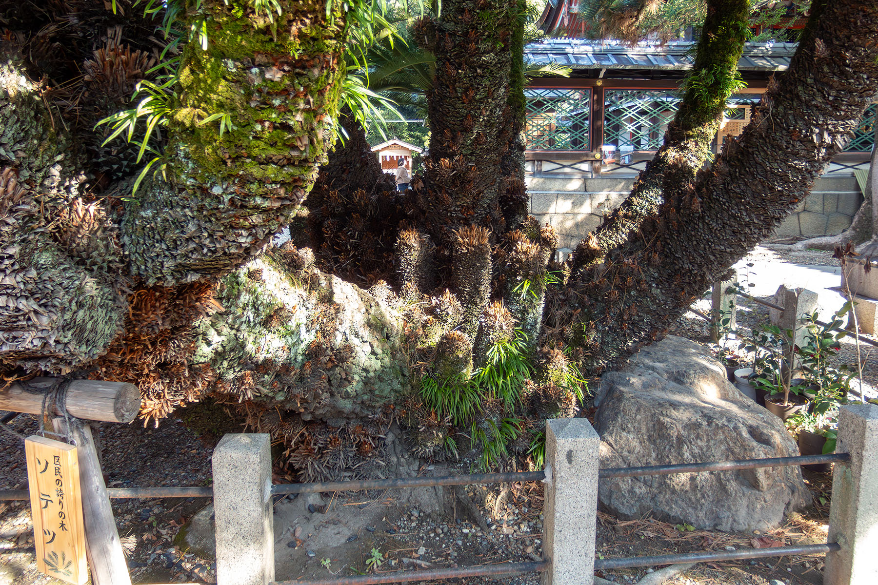 神社にソテツというあまり見慣れない組み合わせ。説明板を読んでみると樹齢は約400年、本来ソテツは南方系の裸子植物なので寒い冬には覆いを施す必要があるが、このソテツは必要がないとのこと。