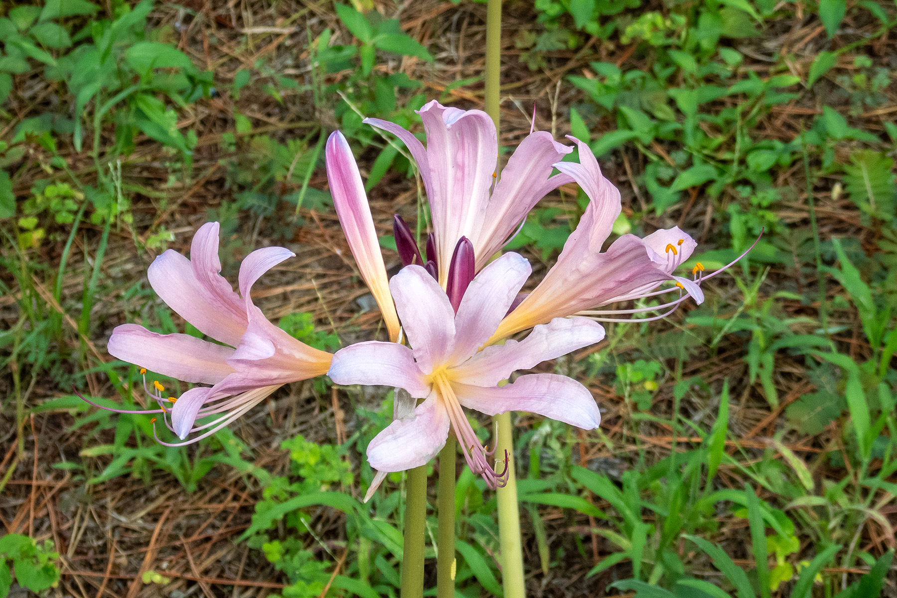 沼津御用邸記念公園の園内を散策していると、遠目に彼岸花っぽい花が咲いているエリアを見つけました。近くでよく見るとナツズイセン(夏水仙)の花でした。(8月15日撮影)