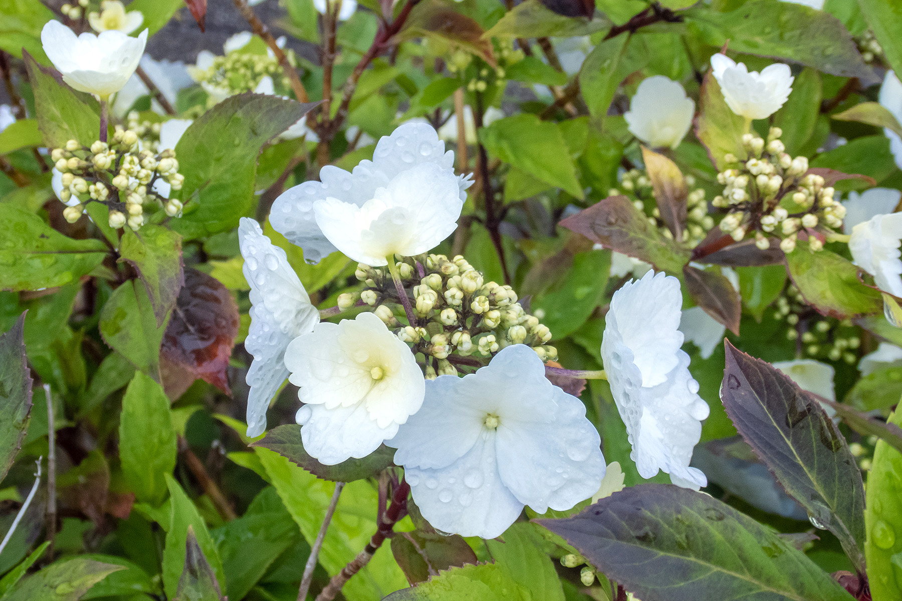 足下に目を向けると早くもアジサイの花が咲き始めていました。やはりアジサイは雨上がりが似合います。