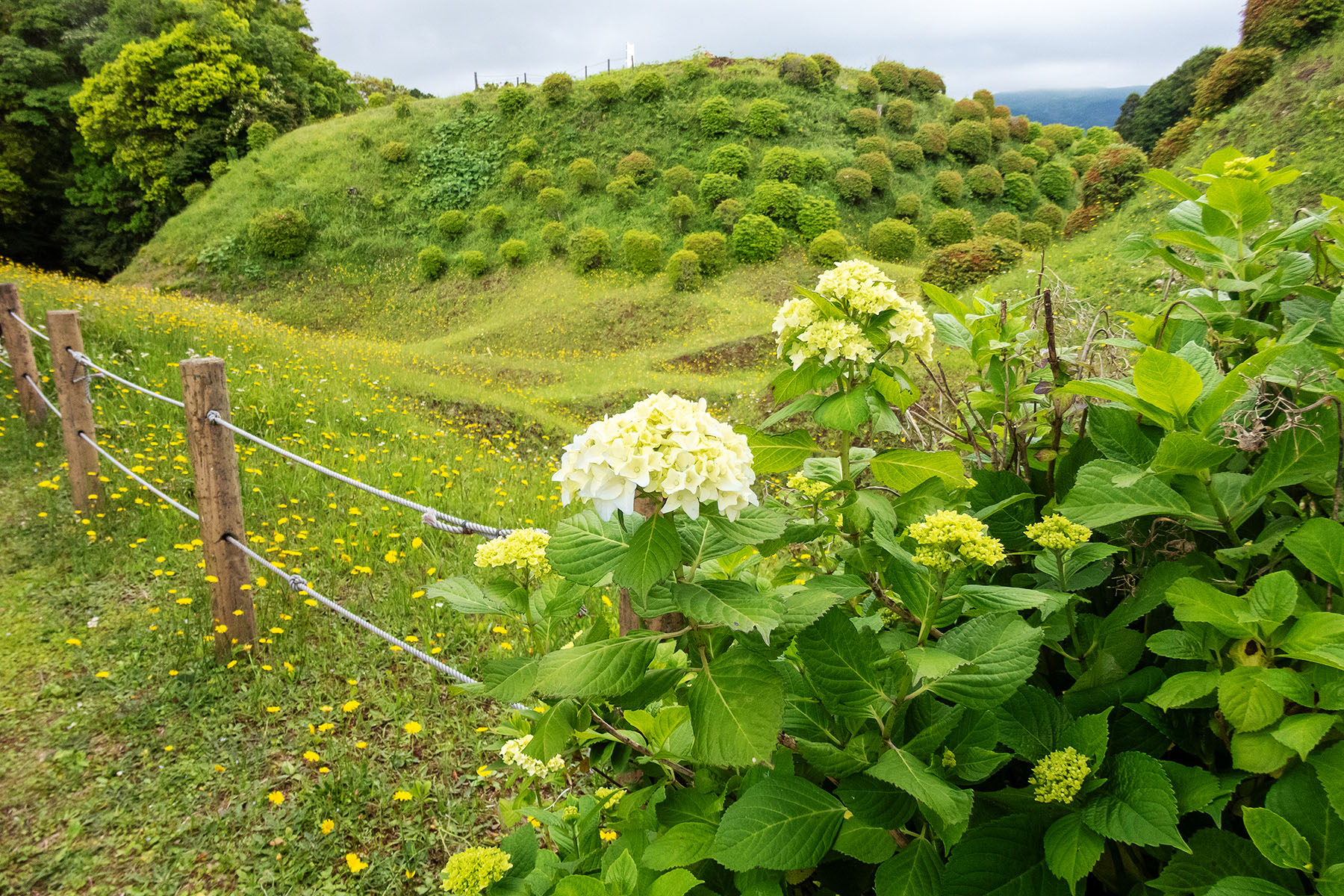 三島市東部の山中城址公園はアジサイの花がきれいなスポットです。アジサイは市街地ではかなり開花が進んでいるので、標高が高いとはいえちらほら開花していることを期待して訪れてみました。その開花状況はというと、写真の通り開花している花はほとんどありませんでした。(6月1日撮影)
