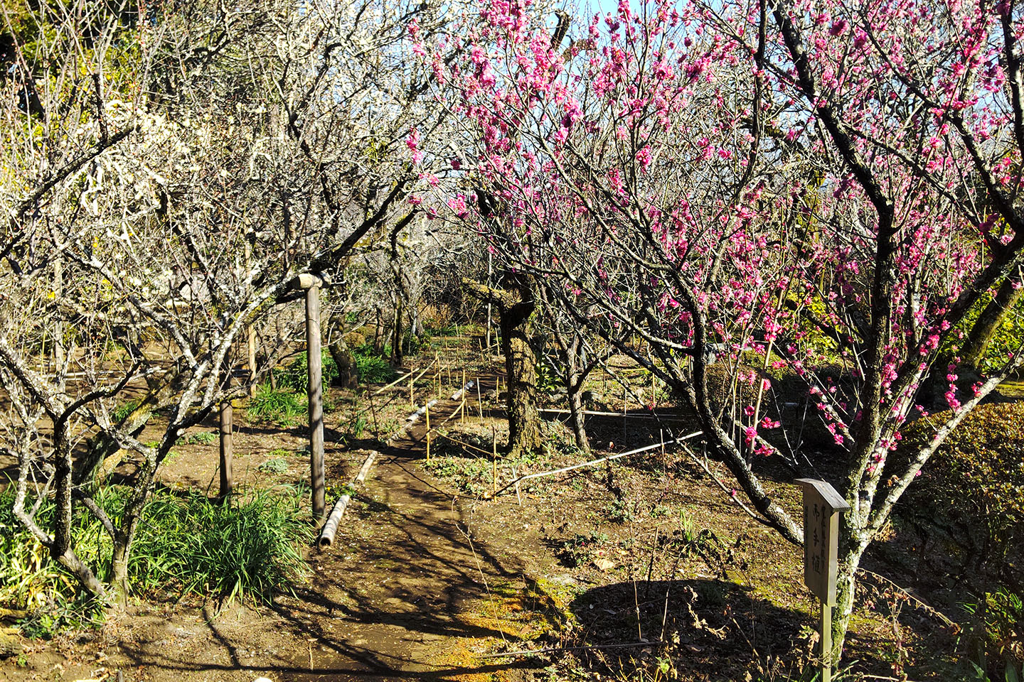 この写真は庭園奥の梅の木が多い辺りの写真です。開花しているものは一部だけで、こちらエリアは例年並のようです。
