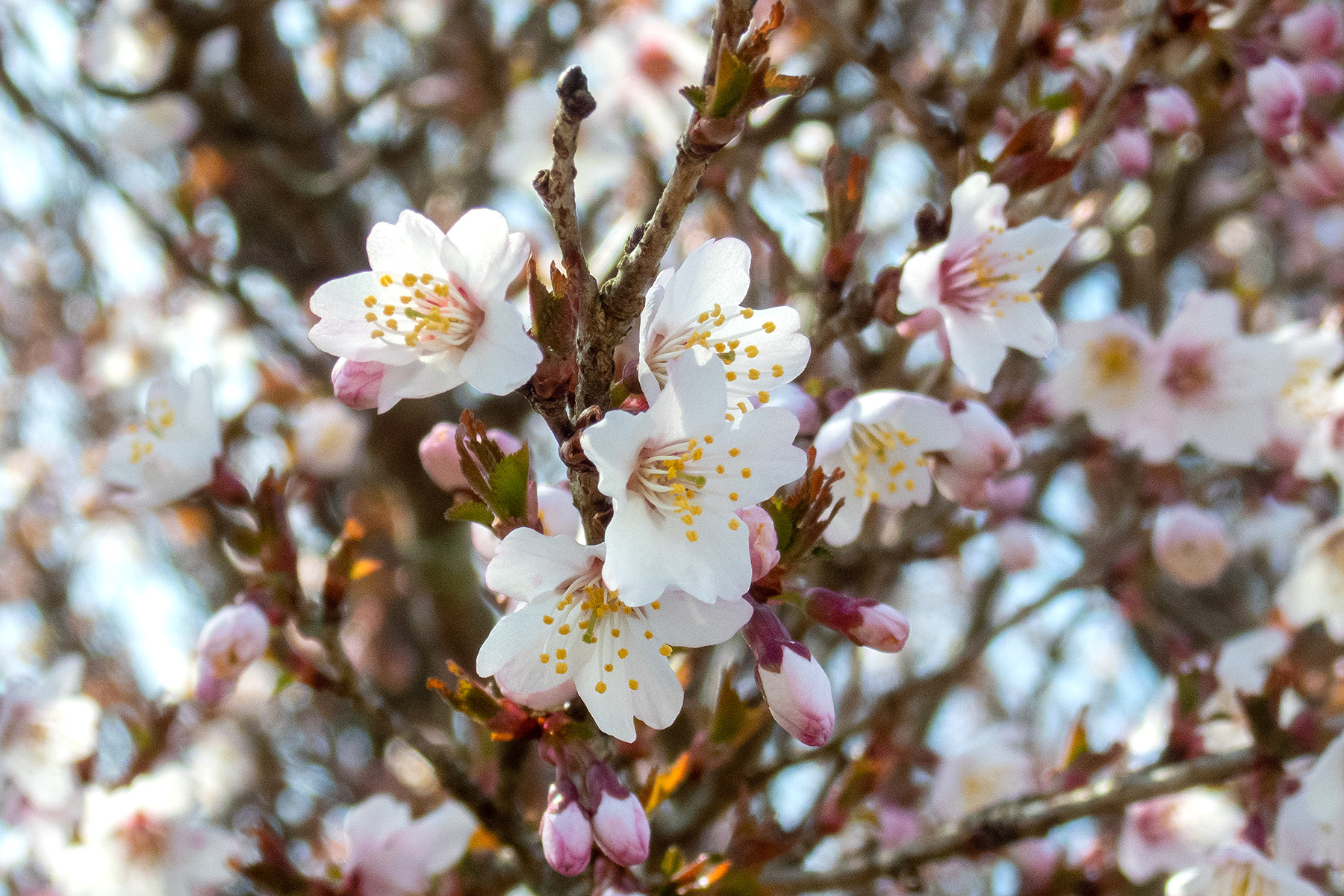 河津桜といいましたが、今年は寒波の影響でどこの河津桜も大幅に開花が遅れているようです。この桜もカンヒザクラ系かエドヒガン系の別の種類の桜かもしれません。濃いめのピンク色で少し黄色みがかった色合いです。