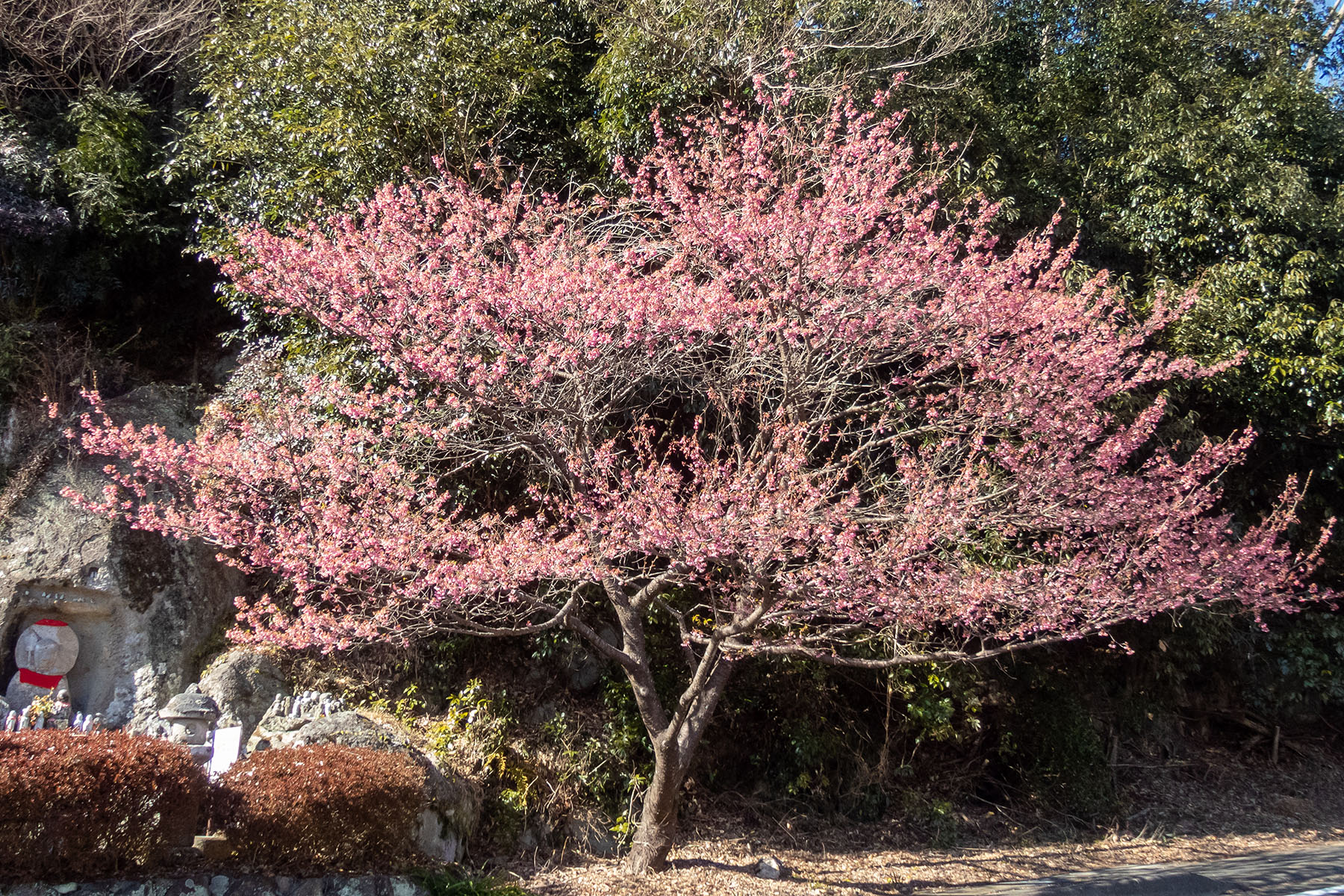 伊豆市の城山ハイキングコース入口にほど近い場所に子育地蔵尊という小さなお地蔵さんが祭られている場所があります。その脇の河津桜が見頃を迎えていました。(2月11日撮影)