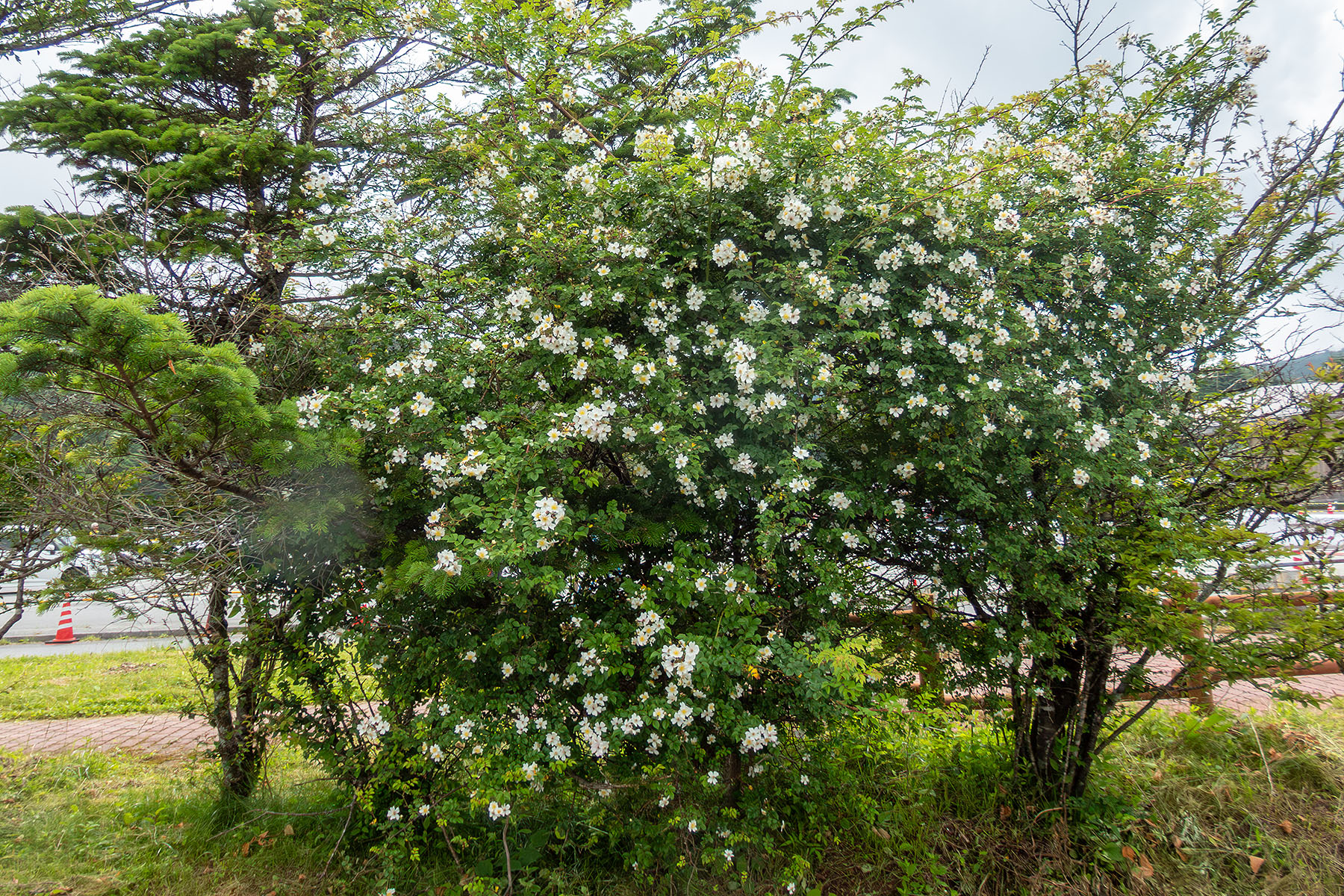バラ園のどこからでも富士山が望めます。剣が峰が真正面にあって普段見慣れた富士山とは違う形に見えます。