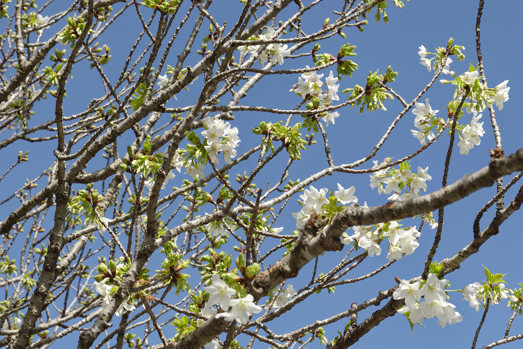 早い年ではオオシマザクラやヤマザクラが散り始めてしまう時期ですが、毎年訪れるフルーツランド前のオオシマザクラは写真のようにまだ2分咲き程度の状況でした。(3月27日撮影)