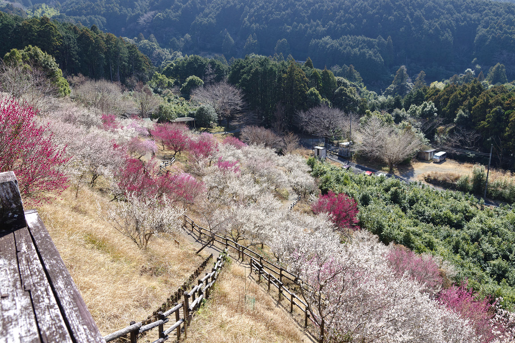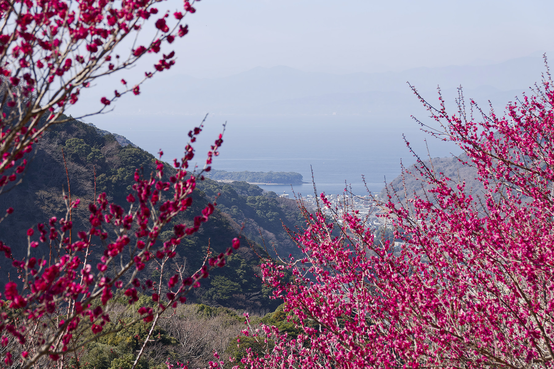 西側に開けた斜面に遊歩道が整備されています。近隣の梅園と比べ規模も知名度も負けていると思います。しかし訪れる人はまばらで変なBGMも流れていません。静かな環境で美しい梅の花と芳香を楽しめます。梅林の最上段には展望台が設置されていて戸田の市街地と駿河湾、晴れていれば南アルプスも展望できます。