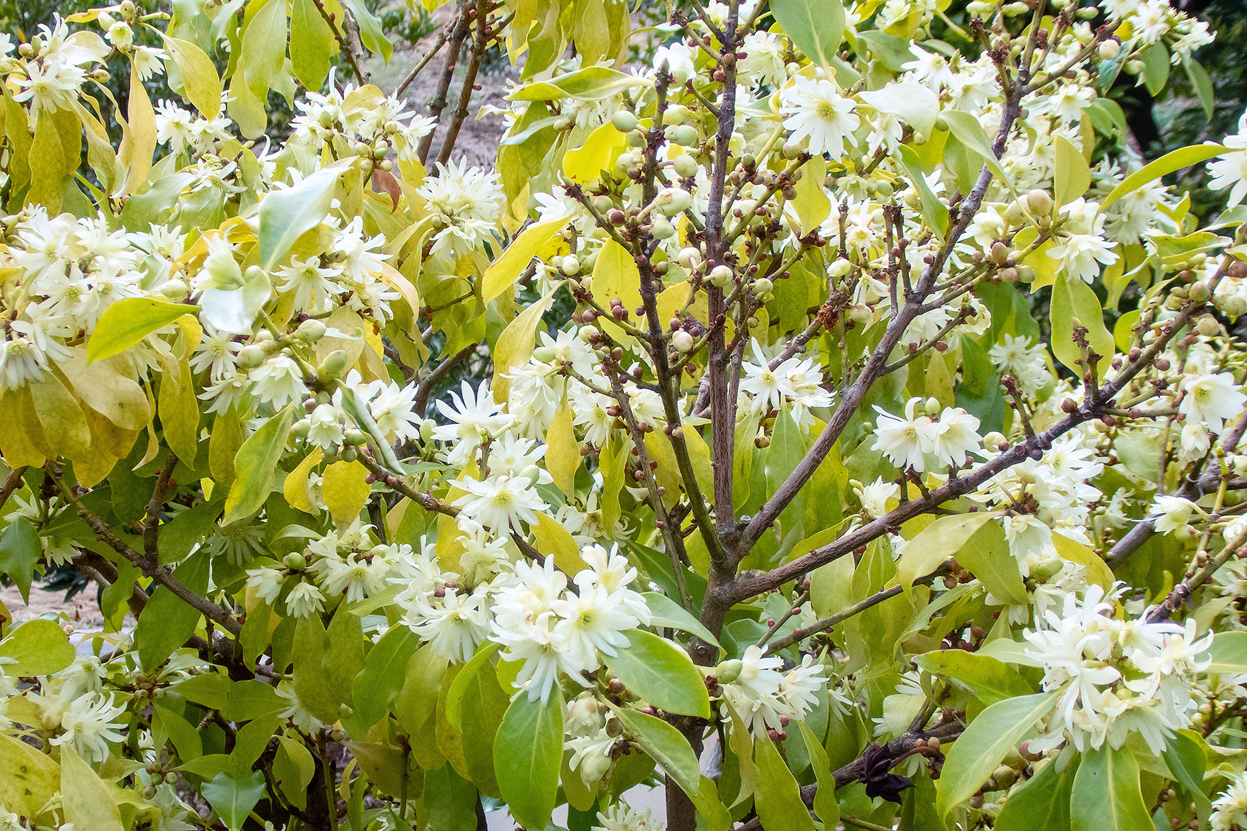 調べてみるとこの花はシキミの花でした。シキミ(樒 / しきび)は仏事でよく使われるおなじみの葉付きの枝のこと。マツブサ科シキミ属というあまり聞き慣れない種類で、葉や茎・花などすべてに毒性がある有毒植物です。特に果実は猛毒で食べると死ぬこともあり劇物に指定されているのだとか。