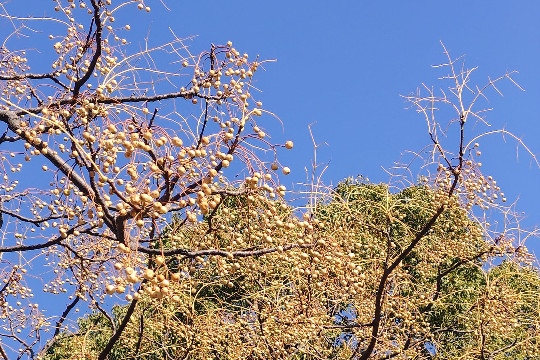 センダンはヒマラヤ原産の落葉高木で、日本では海岸近くの温暖な森林に自生するとのこと。公園や街路樹にもよく利用されています。夏期は5月〜6月頃、10月頃に実が成り落葉してもそのままなのでよく目立つようになります。実は有毒なのですが鳥たちには関係ないらしく大好物とのこと。人間も薬用として広く利用している有用な植物なのだそうです。