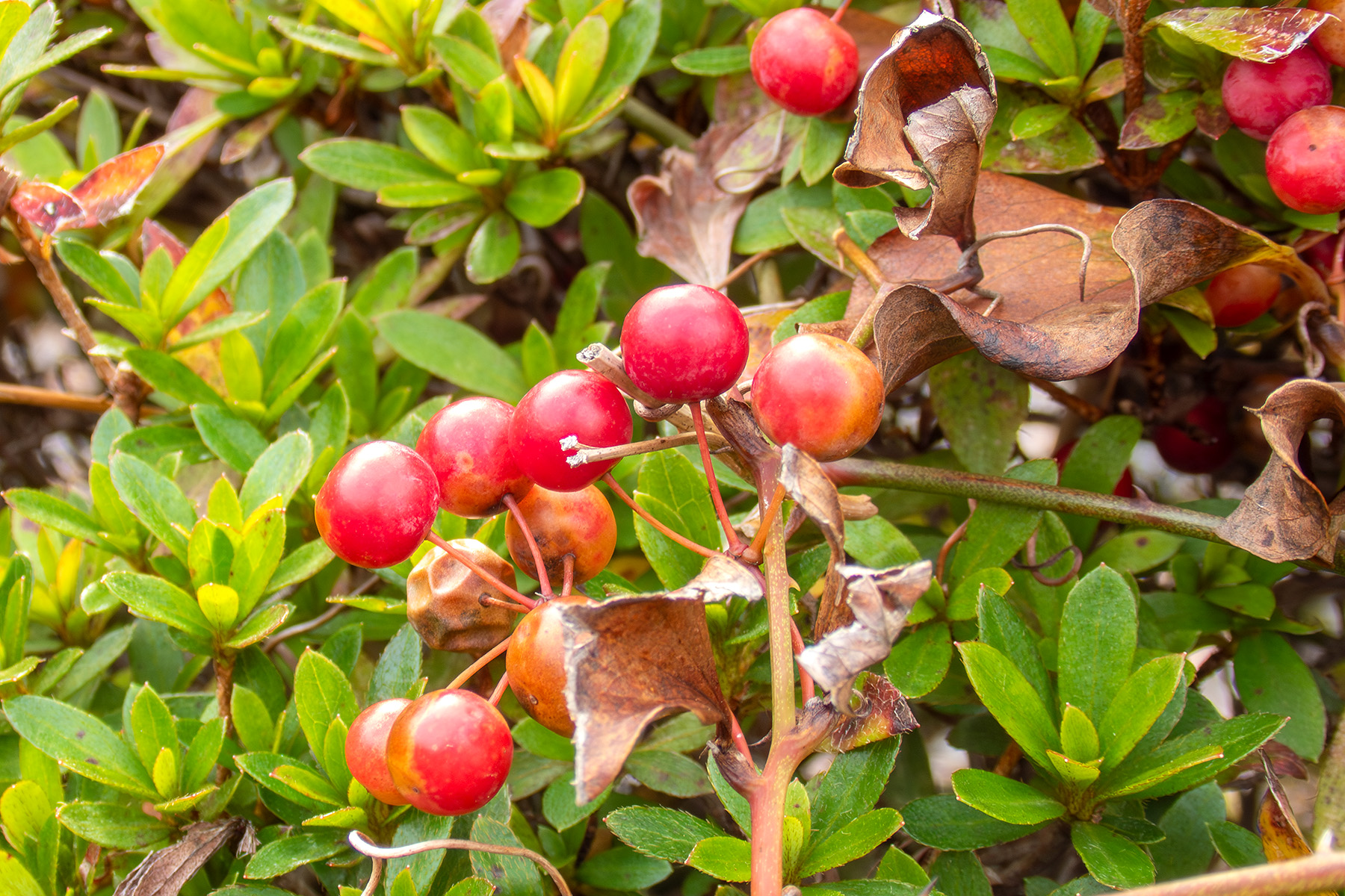 こちらの赤い実は奧野ダムのすぐそばで見つけたものです。残念ながら調べても名前は判りませんでした。紅葉の季節は木々が実を付ける季節でもあります。紅葉散策をする時に赤い実を見つけるのも楽しみの一つです。