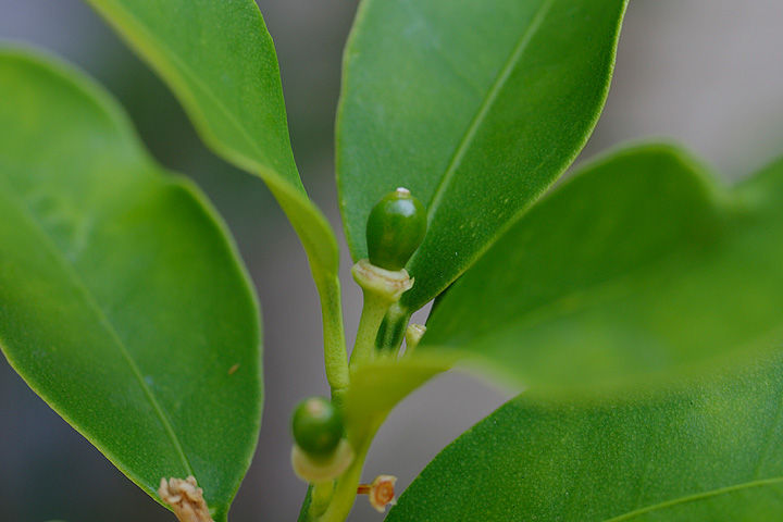 2週間ほど前に満開になったキンカンの花(今年は3番花)ですが、今はこの写真のようにとても小さな実を沢山付けています。