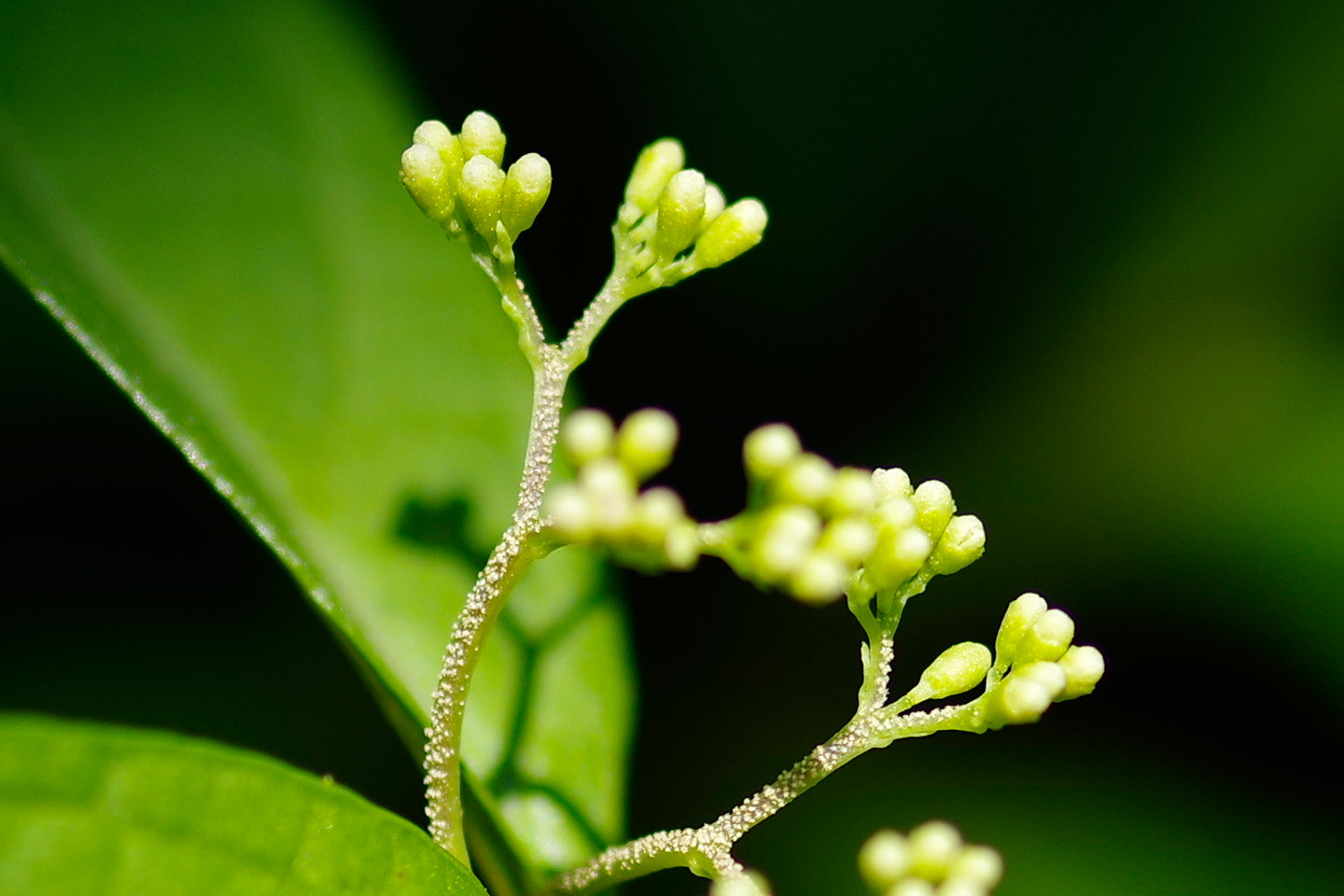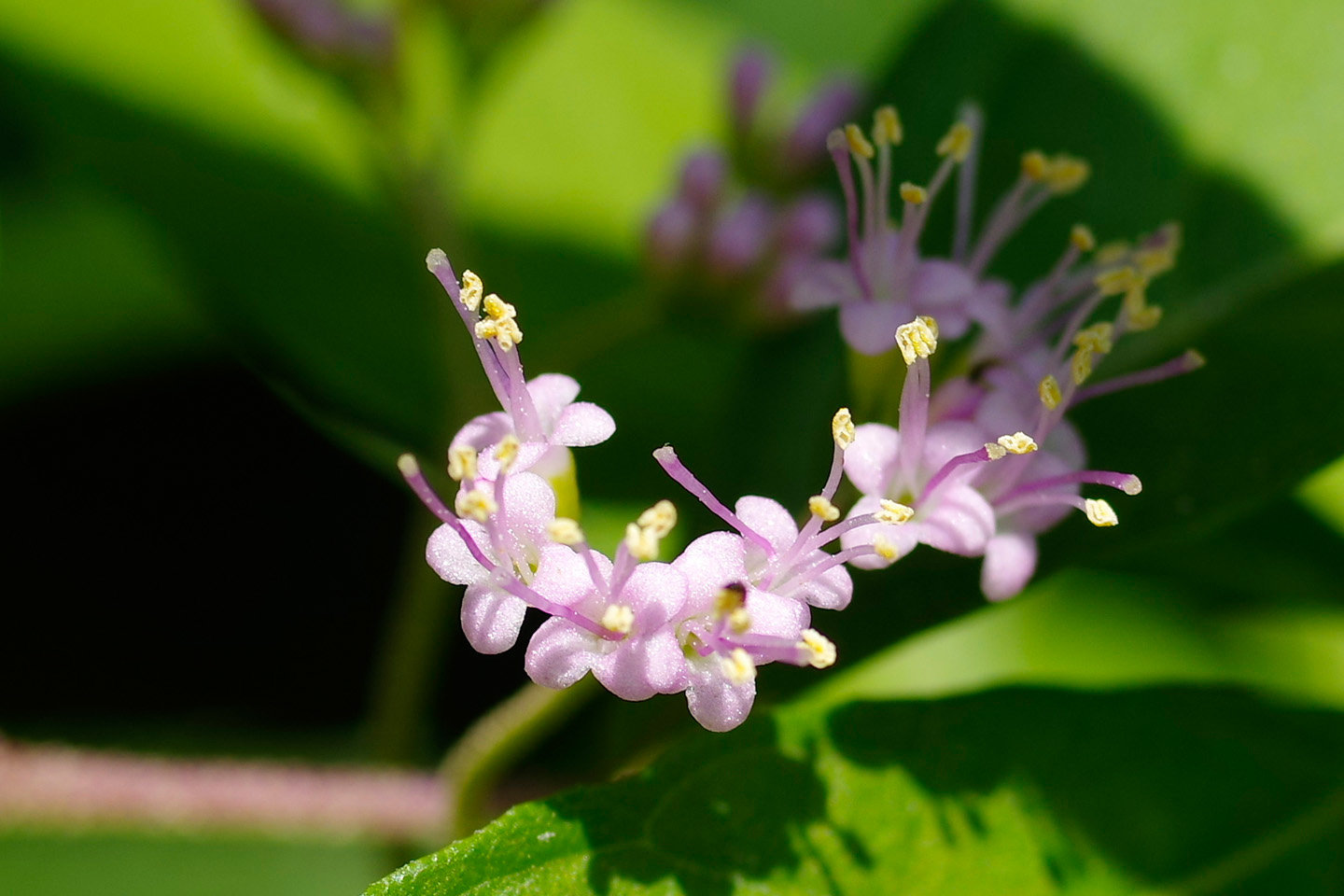 紫の丸い実に惹かれて昨年植えたばかりで、初めての開花です。