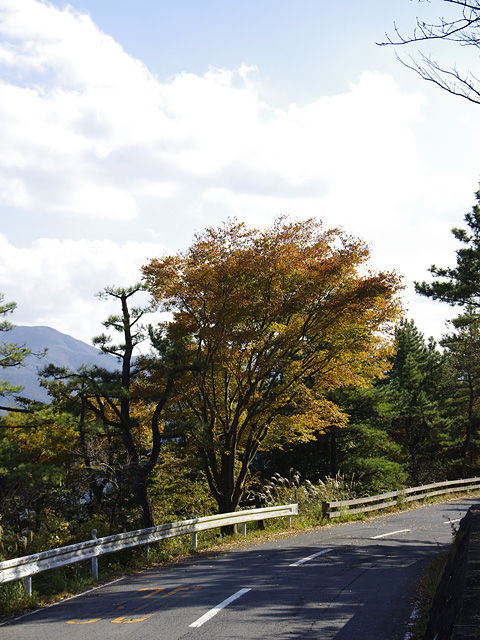 2010年11月6日、神奈川県と静岡県の県境・足柄峠の万葉公園付近では、山々が色づき始めていました。木によっては葉っぱが紙吹雪のように散っていて、とてもキレイです。紅葉のピークはあと1〜2週間先だと思われます。